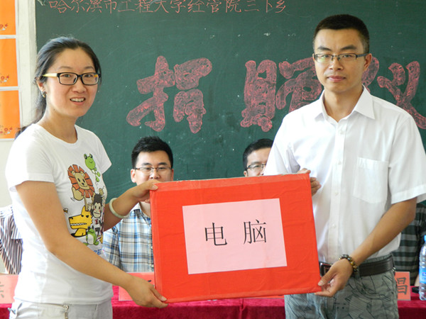 接着,太阳集团tyc234cc团委书记史波老师、副书记于云亮老师向新荣小学两名学生捐赠助学金,tyc234cc 太阳成集团学工办主任向新荣小学捐赠了电脑、投影仪、学习用品、体育用品等。