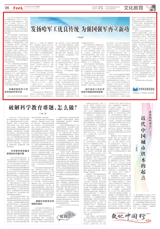 6月28日,《学习时报》“文化教育”版头题位置,刊发哈工程校长宋迎东署名文章《发扬哈军工优良传统 为强国强军再立新功》。文章指出,要坚持践行“哈军工”优良传统,开创拔尖创新人才自主培养新局面,勇攀高水平科技自立自强更高峰,打造国家战略人才力量、勇做时代发展的弄潮儿,续写强国强军新篇章。