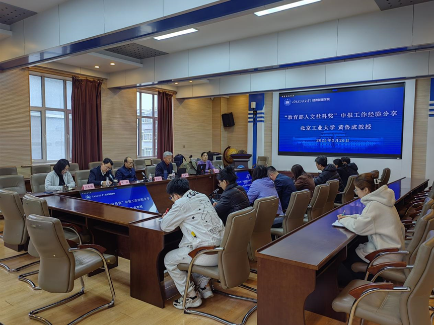 为进一步提升我院师生的申报积极性,充分发挥高等学校科学研究优秀成果奖(人文社会科学)激励导向作用,促进学院高水平科研成果的产出,3月26日下午,学院特邀北京工业大学黄鲁成教授为学院师生进行 “教育部人文社科奖”申报工作经验分享,院长陈恒、副院长胡玉真、院长助理王志楠,以及学院重点培育成果的负责人李柏洲教授、韩国元副教授等教师代表和部分研究生参加了分享活动,活动由胡玉真主持。