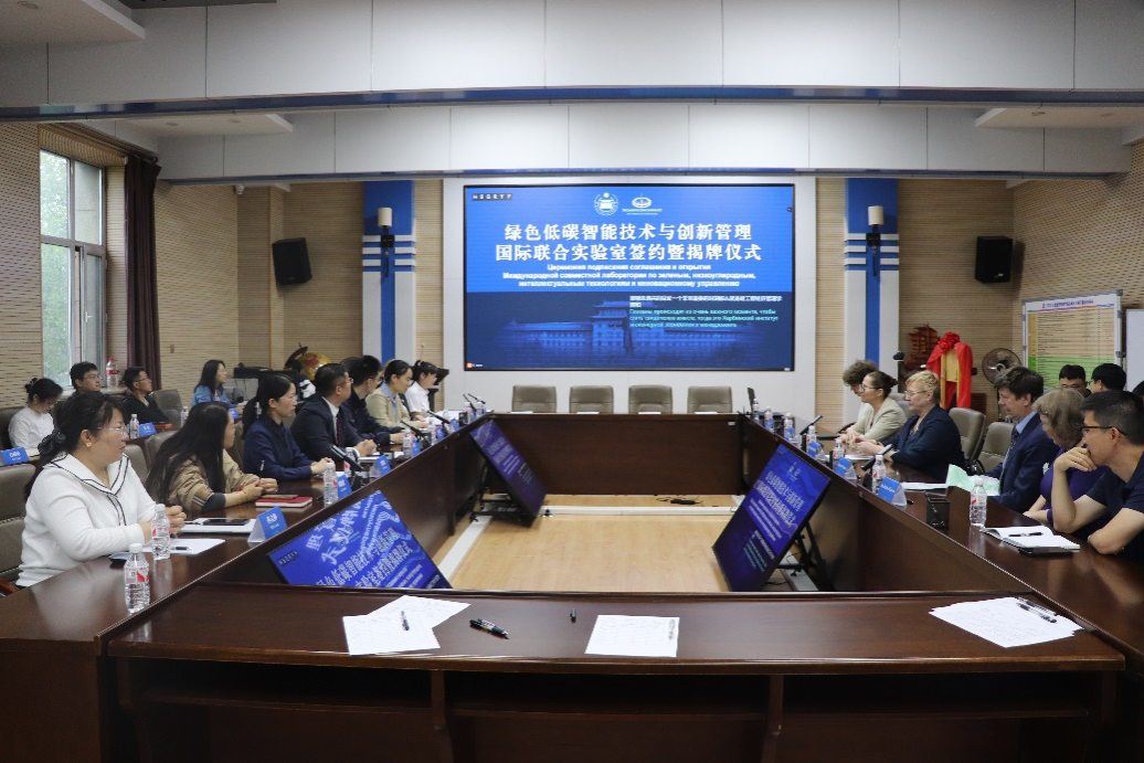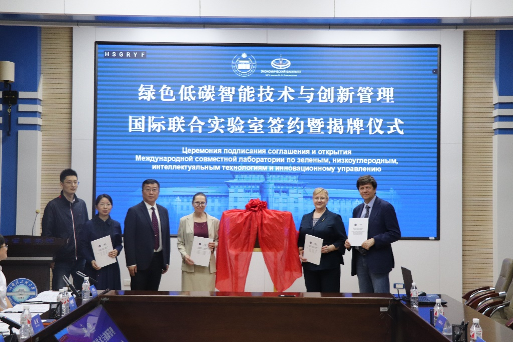 随后,窦峥处长、刘天森副院长、李婉红教授以及莫斯科国立大学Sheresheva Marina教授、Kapoguzov Evgenii教授、Malikova Olga教授共同为“绿色低碳智能技术与创新管理”国际联合实验室揭牌。