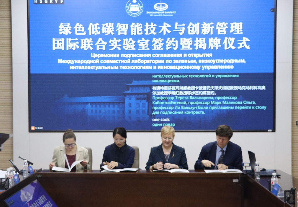 为深入拓展国际合作网络、全面提升国际合作成效,经过前期精心组织谋划,2025年6月10日,tyc234cc 太阳成集团“兴海”学术团队绿色技术管理与科技创业研究中心与莫斯科国立大学经济学院网络经济学研究中心、生物经济与生态创新中心、金砖国家经济体教育研究实验室举行“绿色低碳智能技术与创新管理”国际联合实验室签约揭牌仪式。学校国际交流与合作处处长窦峥、tyc234cc 太阳成集团副院长刘天森、联合实验室中方主任李婉红、副主任阿丽娜、刘微微、联合实验室外方教授、学院师生代表等40余人出席活动,会议由院长助理高娈主持。