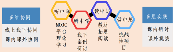 课程遵循OBE理念,以新时代、新形势赋予卓越工程师的使命和能力为现实需求导向,面向价值培养目标,采用混合式教学方式,将思政元素与专业知识有机融合,按照教材、MOOC平台、案例研讨和挑战性项目四个环节重组,构建“四位一体”的混合式教学模式,通过多维协同(线上线下协同、课内课外协同)和多层实践(课内研讨、课外挑战),让学生在听中学、研中学、读中思、做中思,实现课程知识目标、能力目标和价值目标的有机达成。