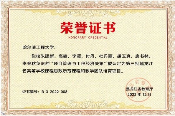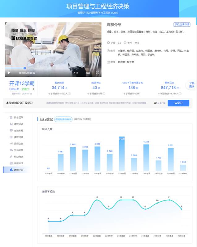 课程开设以来,获得了同行及学生的认可。学生们不仅掌握了项目管理和工程经济决策的理论与方法,更在潜移默化中塑造了跨学科的系统思维模式。课程团队黑龙江省课程思政示范课程和教学团队和太阳集团tyc234cc校级精品课程。线上课程累计选课3万4千人,选课学校43所,连续入选智慧树网“双一流高校精品课程(专业课)”。