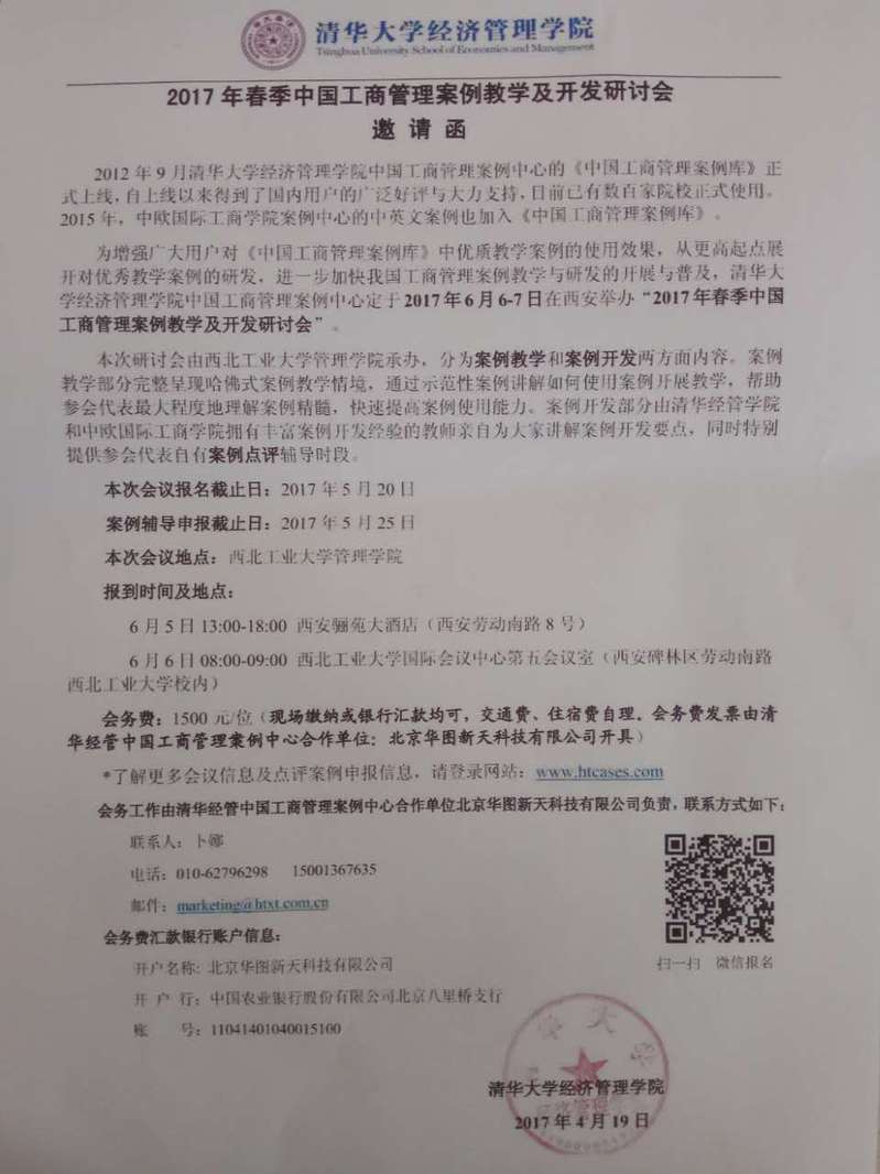 清华大学tyc234cc 太阳成集团中国工商管理案例中心定于2017年6月6-7日在西安举办“2017年春季中国工商管理案例教学及开发研讨会”,详情见下图。