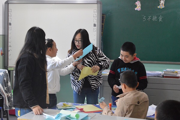 刚到教室,志愿者们就受到了学生的热烈欢迎。志愿者们先进行了简单的自我介绍,活动分为科普与动手两部分,先简单讲解了一下风力的科普知识,随后便以讲解手工折纸和画画展开。活动中,志愿者耐心地教孩子们叠纸飞机、风车和衣服裤子,孩子们都特别认真地学习,叠好就高兴地举手向我们展示成果,特别的天真可爱;接着志愿者开始教孩子们画恐龙、“老丁头”、小手枪、冰激凌、菠萝,一听到要画画,孩子们都兴奋的拿出自己的画笔画纸仔细的画,还不时的提出问题:“这是什么啊,怎么画的好看啊”等等,活动就这样在孩子们的欢声笑语中结束了。