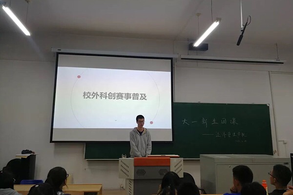 团课开始,首先,高水平竞赛部部长陈震为大家介绍本次团课的主要内容——创新创业普及。接着,普及部部长刘迪为大家详细介绍了的具体内容,包括各种校内赛事和立项,并强调其重要性。最后,陈震部长为大家讲解了院系品牌赛事以及校外各种竞赛,并具体讲参加校外赛事对期末评奖评优以及保研的影响。