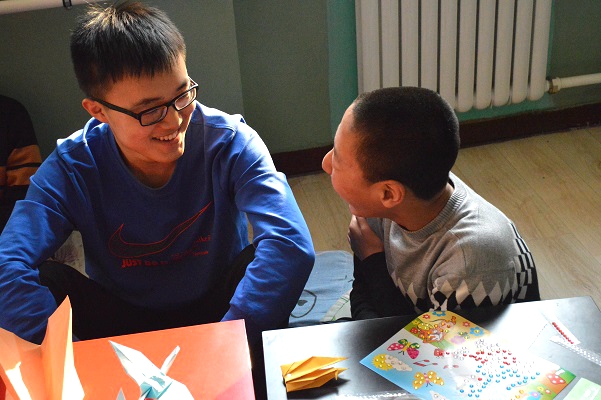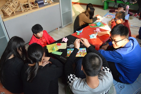 这是一节手工课,每个人可以自由选择想要完成的作品,可以做水晶钻石贴画或者折纸。课堂开始,每个人选择自己喜欢的手工工具,完成作品。志愿者负责协助他们完成作品,他们不会做时教会他们怎样做,做错时及时指出改正。课堂上,孩子们一边完成手工作品,一边与志愿者交流学习生活上的趣事,课堂气氛轻松活跃。课间休息,铃声响起,志愿者们督促指导孩子们做眼保健操,希望他们保护视力从小做起。下课铃声响起,孩子们都完成了自己手工作品。最后,与志愿者们合影留念,此次活动圆满结束。