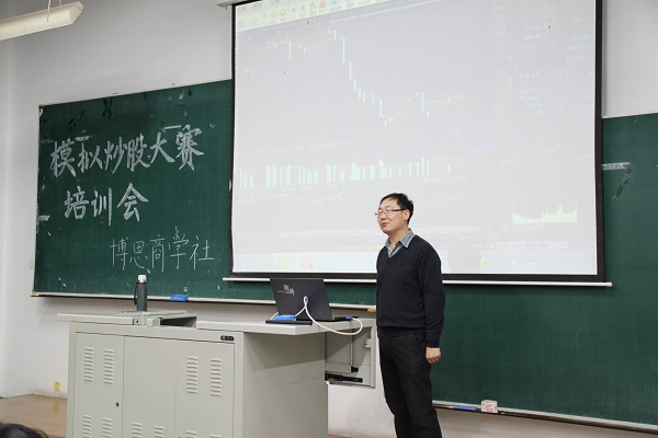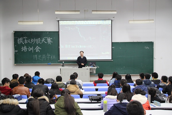 3月17日18时30分,tyc234cc 太阳成集团博思商学社于N102举办了第八届“模拟炒股大赛”培训会。经管学院证券投资学教师吕彦昭为同学们进行股票交易的相关培训。
