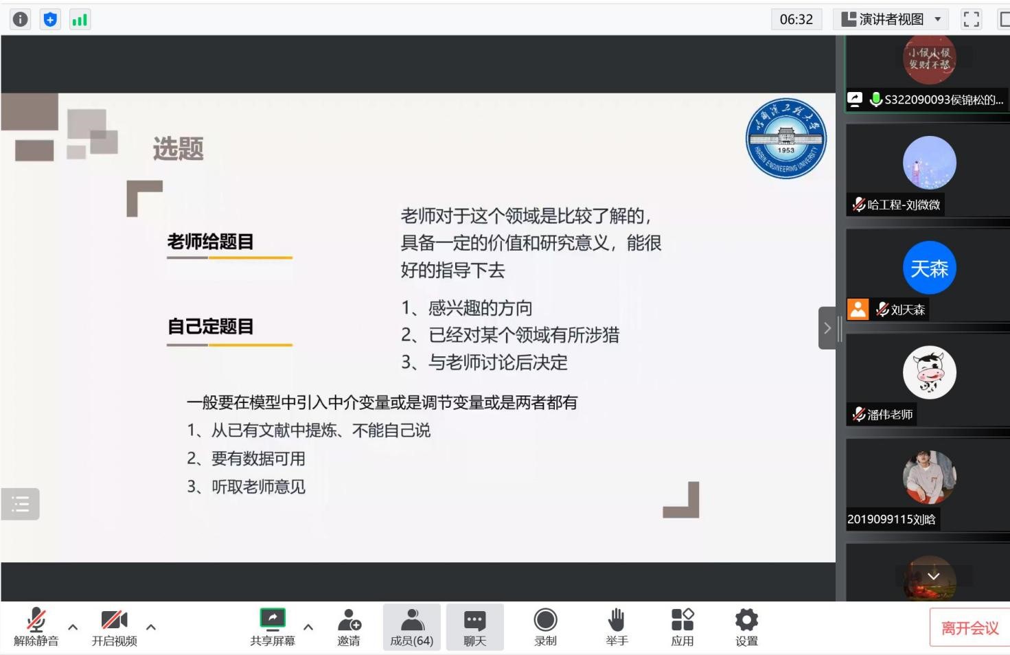 结合自身经验,侯锦松同学首先强调了论文选题的重要性,建议大家积极与导师沟通、紧跟导师指导思路,尽快完成选题工作。在此基础上,侯锦松同学全面详细地分享了关于论文写作思路构建、章节结构安排、文献阅读方法、实证研究方法、相关软件应用、参考文献规范、查重过程注意事项等方面的经验和感受,建议大家树立端正的科学研究态度、认真学习相关科学研究方法、避免出现学术不端行为。同时,侯锦松同学建议大家认真把握本科毕业论文撰写的宝贵机会,提升自身科学研究能力和文字表达能力。