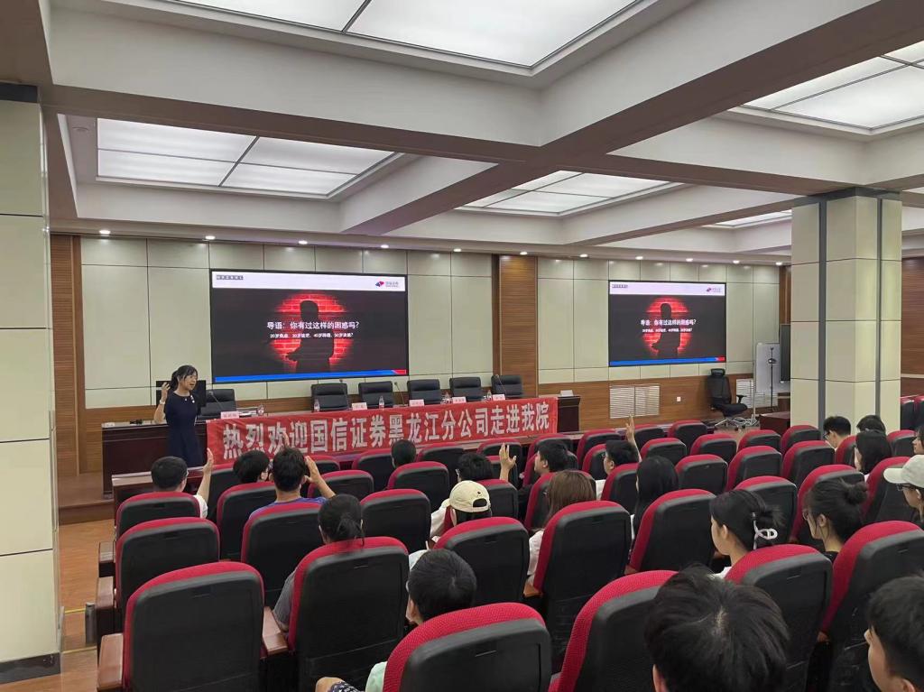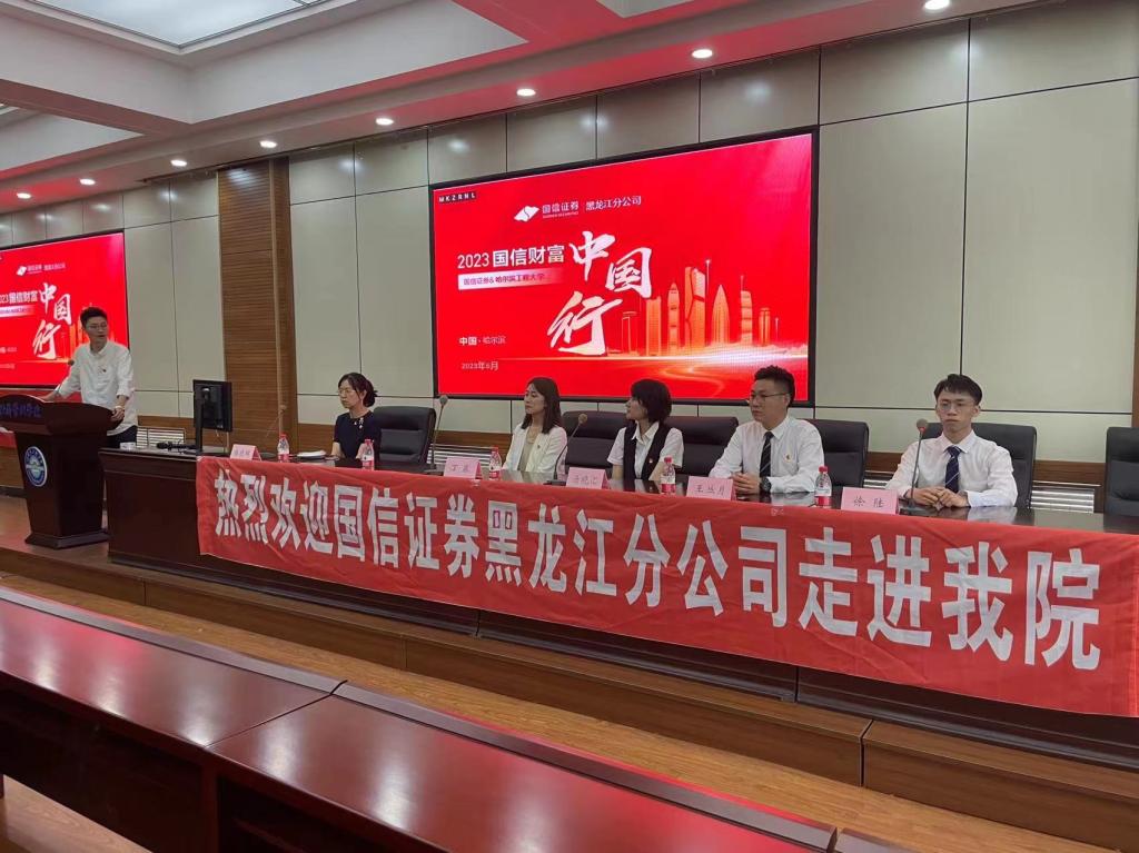 2023年6月16日,工商管理党支部邀请国信证券黑龙江分公司丁淼老师(副总经理)、陆晓辉老师(业务管理部总经理)、汤晓汇老师、王丛月老师、徐陆老师为我院本科生和研究生开展职业生涯规划指导讲座。工商管理党支部书记刘天森同志主持讲座。